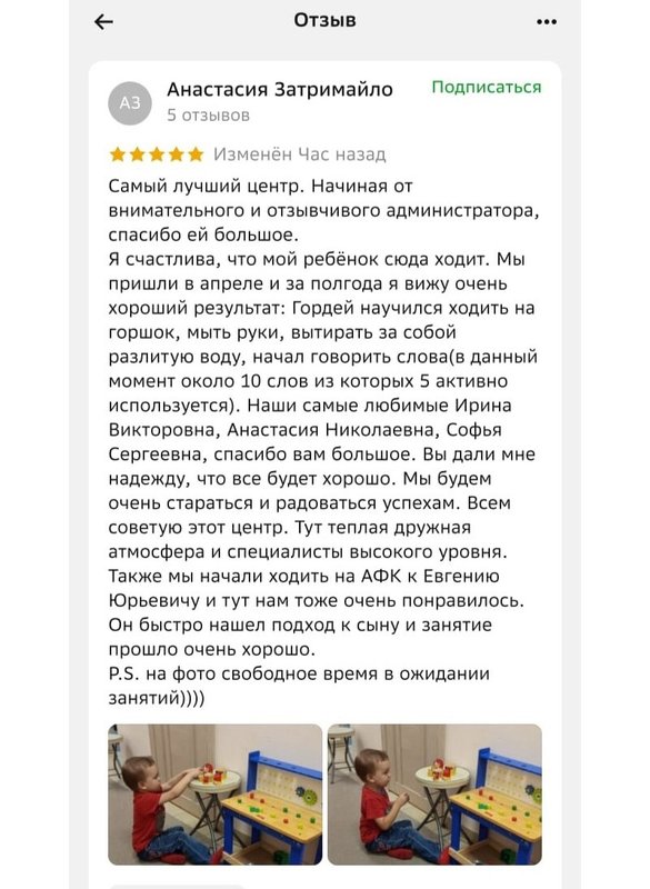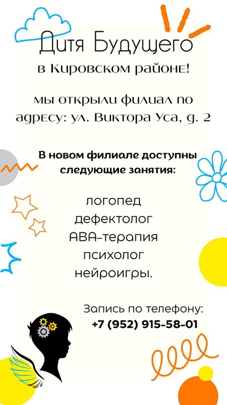 Здесь нежно развивают интеллект детей и подготавливают их к взрослой жизни в новейшей информационной эпохе. Педагоги не только занимаются подготовкой к детскому саду и школе, обучая различным навыкам и техникам коммуникации. Именно после таких занятий детки начинают осознавать себя как взрослые личности и уже в раннем возрасте начинают понимать, чем хотят заниматься в жизни. Дети - это наше будущее, а значит, им стоит отдавать все самое лучшее. Детский развивающий центр Дитя будущего предлагает вам достойное место, где готовы развивать интеллект ваших детей, учить их навыкам общения, показывать пример искренней дружбы, а также учить их не бояться всех трудностей, которые могут встретиться на жизненном пути.
